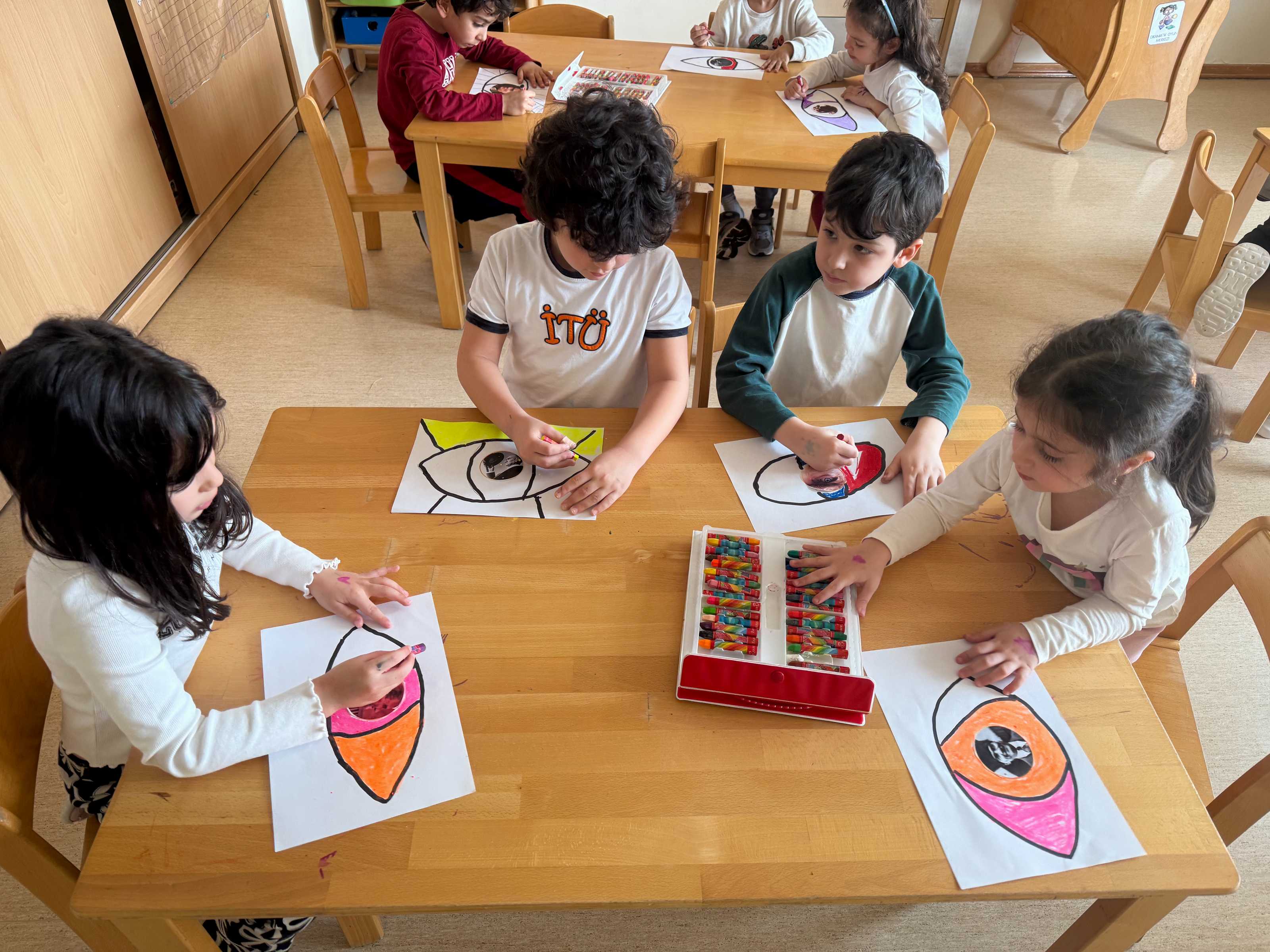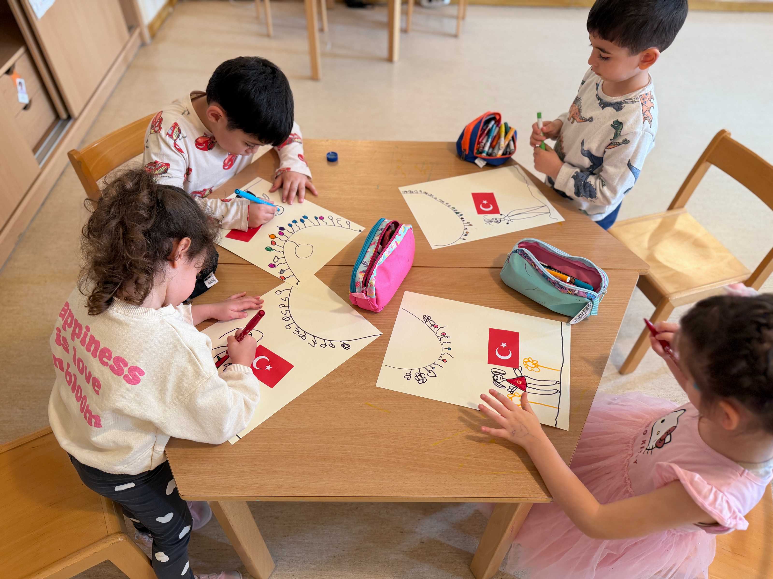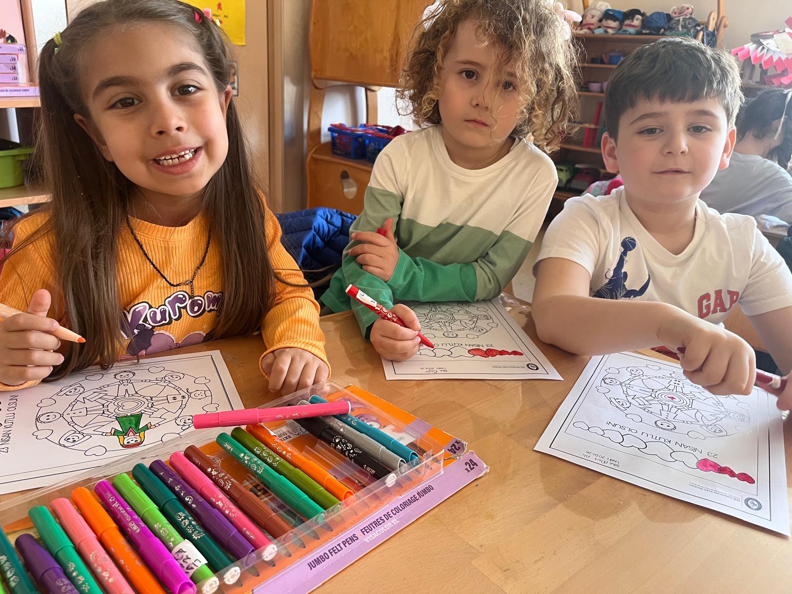 Anaokulu öğrencilerimiz, 23 Nisan Ulusal Egemenlik ve Çocuk Bayramını büyük bir coşkuyla karşılamaya hazırlanıyor. Hazırlıklar kapsamında ellerine fırçalarını alan minik sanatçılarımız, 23 Nisan temalı resimleriyle hayal güçlerini kağıtlara döktü.